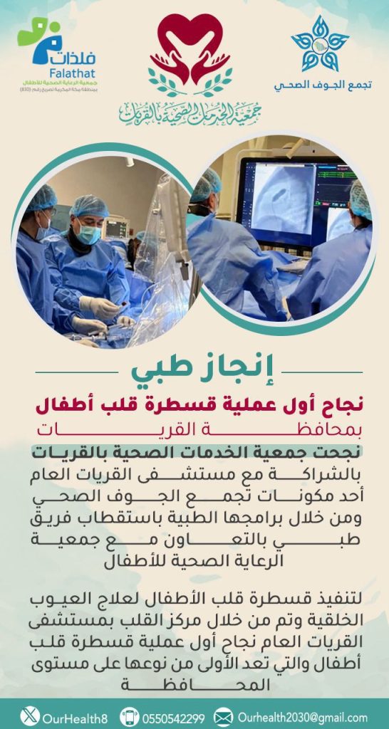 يسر جمعية الخدمات الصحية بالقريات بالشراكة مع تجمع الجوف الصحي ممثلا بمركز القلب بمستشفى القريات العام وبالتعاون مع جمعية الرعاية الصحية للأطفال عن الإنجاز الطبي بنجاح أول عملية قسطرة قلب أطفال